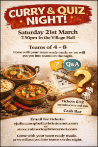Saturday 21st March – 730pm in the Memorial Hall. Tickets £12 including curry and quiz entry.